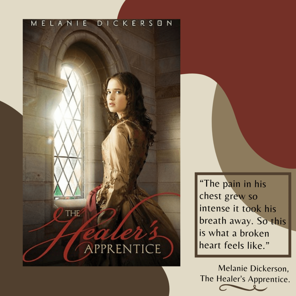 When Lord Hamlin, the future duke, is injured, it is Rose who must tend to him. As she works to heal his wound, she begins to understand emotions she’s never felt before and wonders if he feels the same. But falling in love is forbidden, as Lord Hamlin is betrothed to a mysterious young woman in hiding. As Rose’s life spins toward confusion, she must take the first steps on a journey to discover her own destiny.” – Melanie Dickerson, The Healer’s Apprentice.