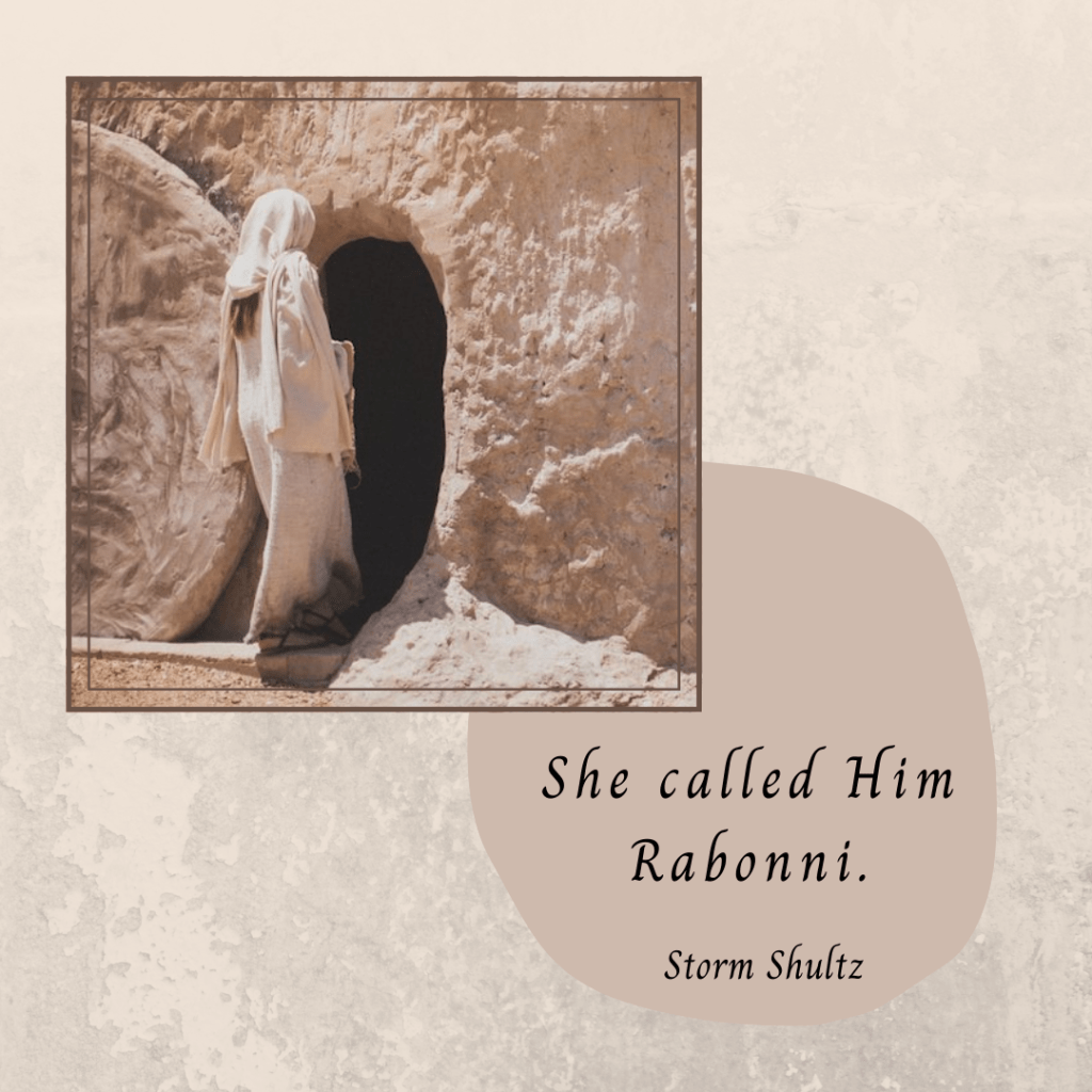 The voice was one she knew. Mary’s heart leapt, causing her to stumble and come to a stop, rooted to the ground with fear and excitement. As if her name had woken a part of her from sleep, the tears stopped, and her breathing calmed. Looking up, she stared into Jesus’s face. It was the most glorious sight she’d ever seen.