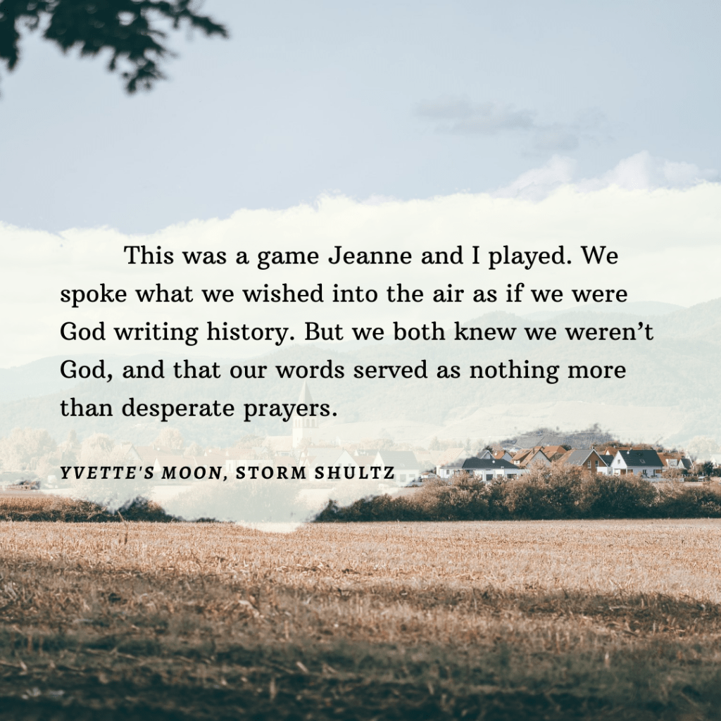 Five years later, a knock at the door makes Yvette believe all her prayers have been answered. But instead of finding her Henri, she finds a German Kommandant. Now Yvette must decide how to honor God, her husband, and her country as she grapples with a decision that will change her life.” – Yvette’s Moon, Storm Shultz